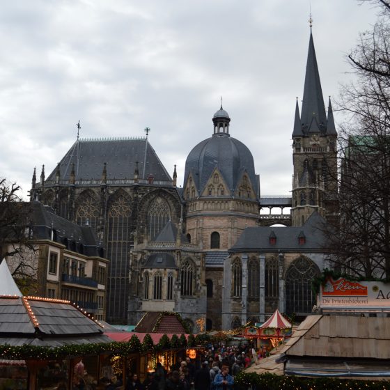 Waiting just a few minutes for the bus, we paid our 5 euros for 2 return tickets and settled down to watch the world go by as we made our way to the city centre. We hopped off in a busy looking area and started our wander towards the market, immediately enveloped in the Christmas spirit, seeing some festive market stalls and just following the crowds. We liked the feel of the old city straight away. It had a welcoming, cosy feel about it even though it was cold with a pretty market spread around in different areas with the main hub having the backdrop of the huge 1,200 year old cathedral which was the very first site in Germany to be listed as Unesco World Heritage with a rich historical and architectural as well as religious significance, having been the site of the coronation of 30 German kings The most famous being Charlemagne (Charles the Great). The market smelled wonderful and it wasn’t long before we were enjoying a ceramic boot mug of steaming mulled wine and a foot long Kohlwurst in a bun (shared), swiftly followed by a bowl of currywurst!