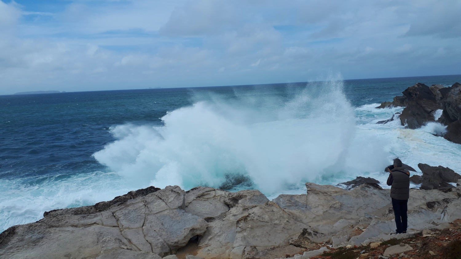 As we pulled up our jaws dropped when an immense, leaning rock stack came into view, standing at a precarious angle, being thrashed by powerful, pounding waves. It didn’t seem possible for the rock to be stood there like that but it was! In the distance you can see all the way out to the Ilha Berlenga, a small ocean ravaged island occupied only by a few fisherman and a sanctury for birds.