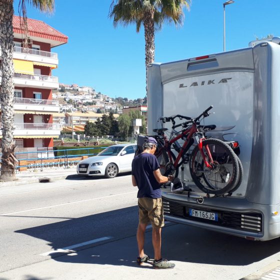After our cave excursion we took Buzz down to the front driving through Rincon de la Victoria before eventually parking on the road at the far end of the coast road. A quick coffee later we unloaded the bikes and hoping for a better result than Calla Mijas cycled down to the promenade alongside the large sandy beach and much to our delight you were allowed to actually cycle on the cycle path. Making back towards Malaga we cycled out along the front stopping at the tourist information office to gather some info, from here you can go all the way into Malaga (only 6km). Cycling through a tunnel under the coast road we stopped to admire the sea view and got talking to a British couple who had been caravanning since September having spent around £7,000 on site fees during that time they were seriously considering a motorhome! They also told us that the over direction was a really nice long cycle. So after a while we headed back to Buzz for lunch before heading back out the other way towards Torre del Mar. Passing several beach bars along the way before eventually turning around and making for a nice looking beach bar we had spied, taking in some warm late afternoon sun. We got talking to a British man an ex merchant seaman who now lives in Malaga, he had cycled out from there and stopped for a beer before heading back. He gave us some advice on where to park in Malaga which we may well use when we head back to Portugal but for now it was back to Buzz and find somewhere to park for the night and more importantly some form of Bun for Monday Bunday.
