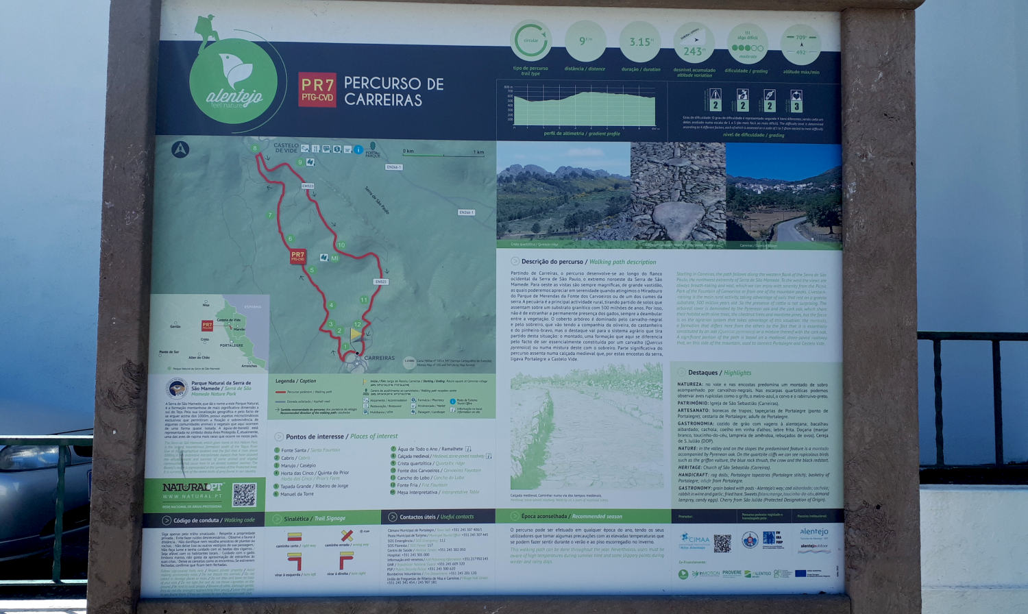 The ‘Feel Nature’ path network has over 30 marked walks and trails you can follow from a 4km to a serious 60km! We chose a 9km circular walk from Carreiras, finding parking in the small town near the starting point and information board. The board told us that the walk was ‘moderate’ and rose to 709 metres above sea level. It’s called the Percurso de Carreiras and its in the Serra de Sao Mamede mountain range, the largest mountainous formation South of the River Tagus. The quartzite cliffs are home to griffon vultures, blue rock thrushes, crows and black redstarts so we went equipped with binoculars to keep a look out.